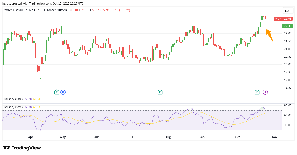 U ziet dat ik weinig heb getekend op de grafiek. Een groene horizontale lijn die na de opwaartse uitbraak dienst doet als steun. En als we het dan toch over steun hebben, het lijkt alsof WDP een throw back gaat laten zien. Naar dat laatste wijst de oranje pijl. Dat wil zeggen, waarschijnlijk gaat de groene lijn getest worden als steun en dat zou een gelegenheid voor spijtoptanten zijn om alsnog in te stappen.