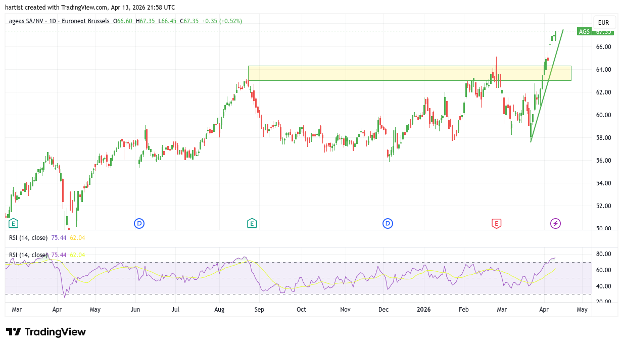 Boven de (nog steeds) extreem stijgende groene trendlijn gaat het crescendo met Ageas. Het oranje blok, toch niet een onbelangrijke weerstandzone, werd opwaarts uitgenomen alsof het niet bestond. En daar hield de stijging niet op. Het aandeel ging verder omhoog en zelfs de RSI (onder de grafiek) doet vrolijk mee.