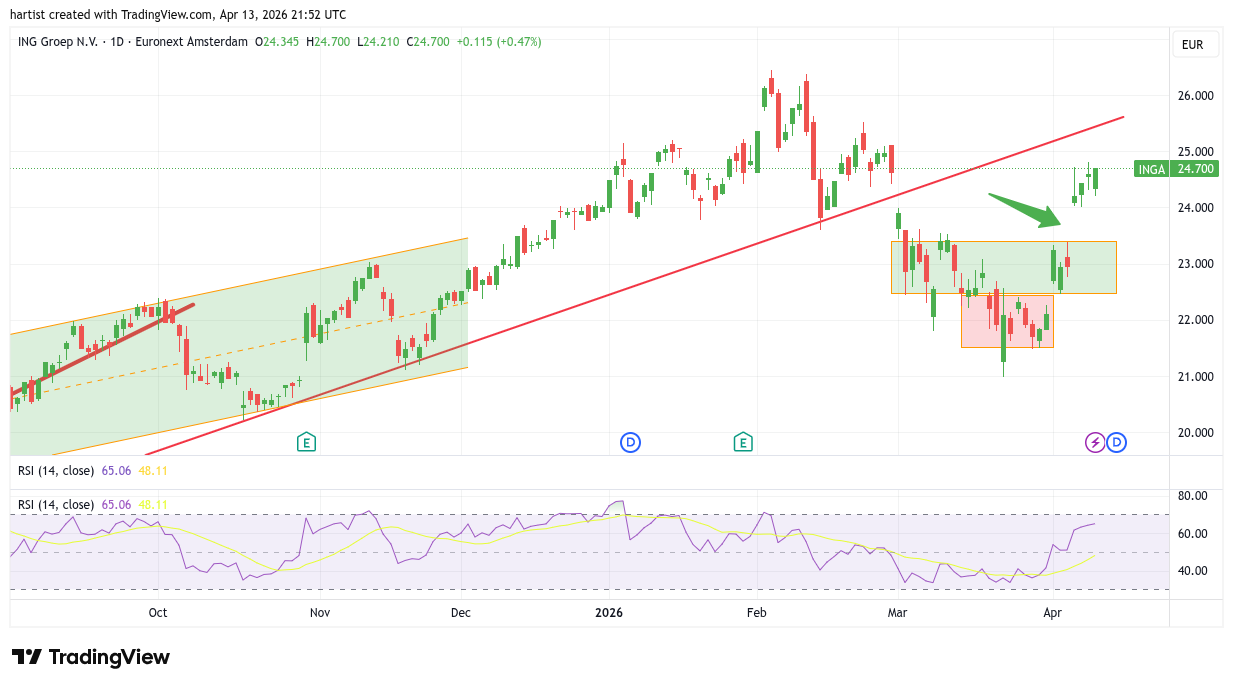 De neerwaartse doorbraak van de rode stijgende trendlijn luidde het einde van de opwaartse trend in. ING corrigeerde maar is nu goed bezig. De opwaartse uitbraak van het rode blokje was een belangrijke eerste stap in de draai van dalend naar stijgend. Inmiddels zijn ook twee (niet getekende) neerwaartse trendlijnen opwaarts uitgenomen inclusief het groene blokje. Dat laatste gebeurde zelfs met een gap, zie de leemte in de grafiek waar de pijl naar wijst.