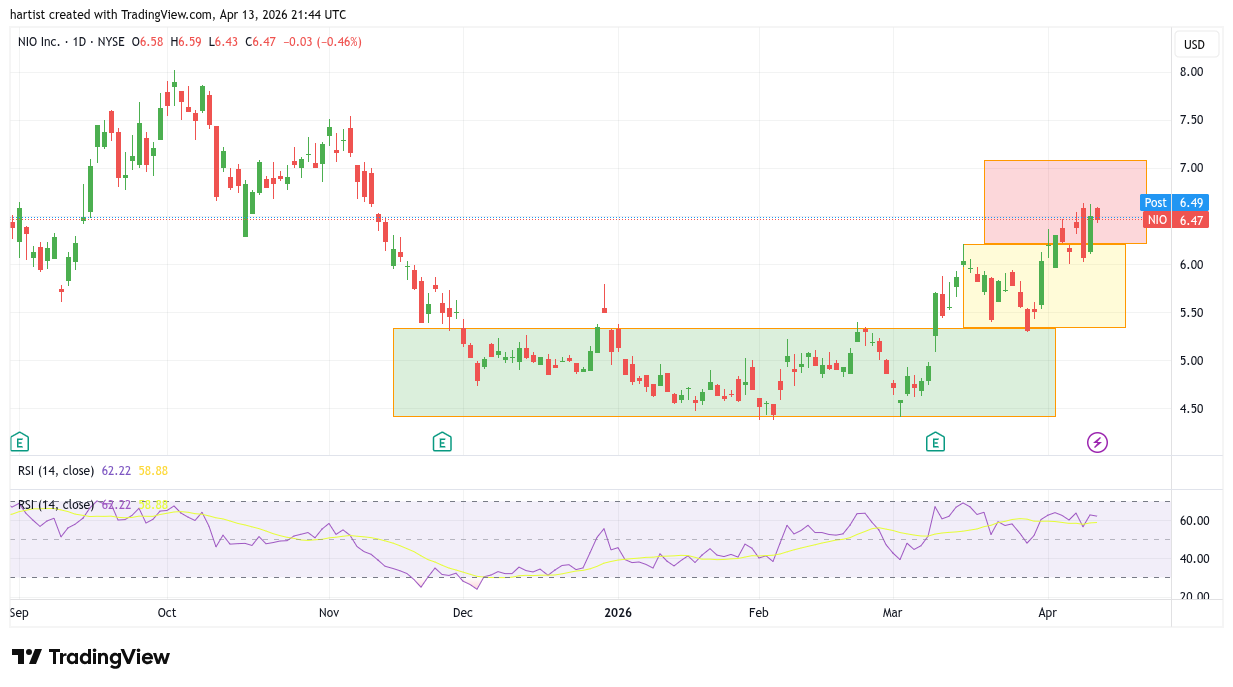Ik trap af met Nio. Links op de grafiek ziet u de daling gevolgd door een zijwaartse beweging binnen het groene blok. De beweging binnen het groene blok kunnen we als een trendomkeer zien, een draai. Na de opwaartse uitbraak werd de bovenkant van het gele blok de target. Het aandeel had er slechts vier dagen voor nodig om het koersdoel te halen. Daarna corrigeerde de koers en nu terugkijkend kunnen we er het stempel “throw back” op plakken. In wederom vier dagen na die throwback ging de koers al in de aanval op de bovenzijde van het gele blok. Met vijven en zessen is de koers opwaarts uitgebroken en nu is de bovenzijde van het rode blok de target.