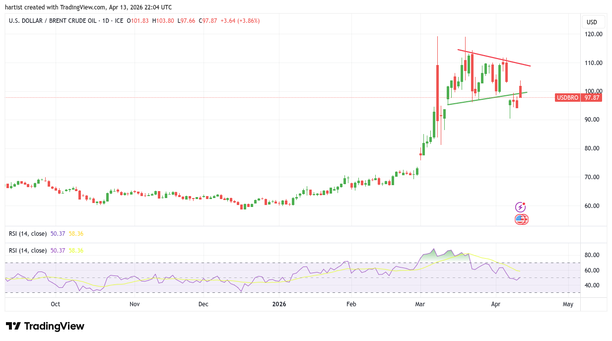 Ik heb de eerder getekende driehoek laten staan, want op de keper beschouwd is die nog steeds van toepassing. De koers viel er aan de onderkant uit, maar met de blokkade van de Straat van Hormus zou je zeggen dat de koers weer (flink?) omhoog moet. Dat deed de koers ook wel, maar slechts intraday kwam de koers weer binnen de driehoek. Nu staat de koers er toch weer buiten… aan de onderzijde.