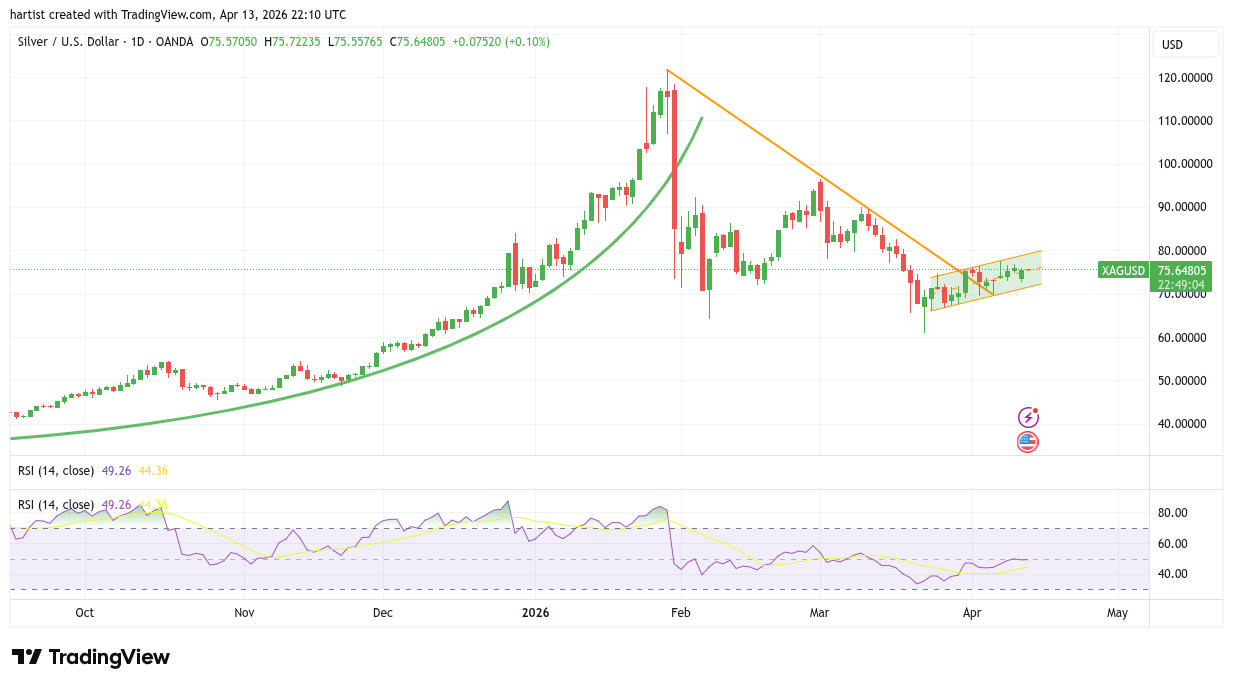 Zilver is opwaarts door de oranje dalende trendlijn gebroken.