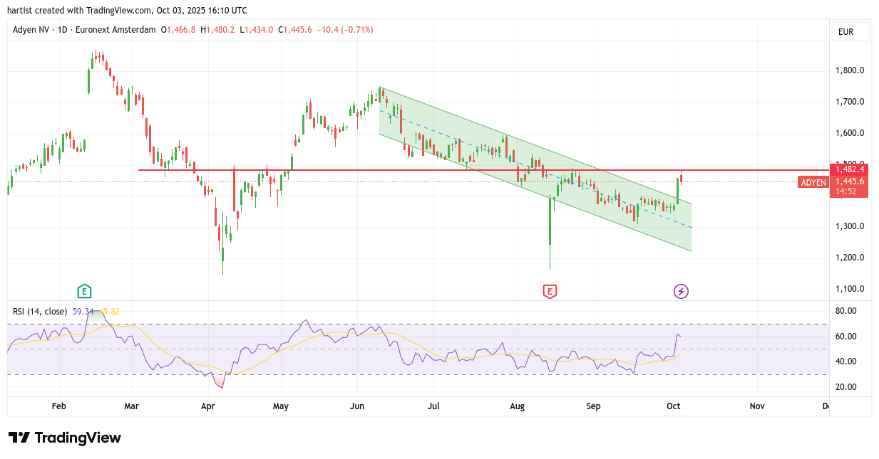 Adyen heeft het dalende trendkanaal opwaarts verlaten, en hoe! Een enorme groene candle. Vandaag ging het iets rustiger hoger, althans intraday. De slot lag namelijk onder de slotkoers van donderdag.