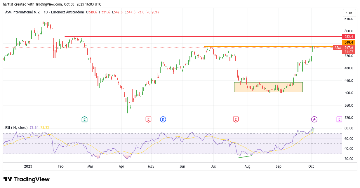 Zo’n beetje alle IT-gerelateerde bedrijven zijn gestegen en ASM International vormt daar geen uitzondering op. Het rode bodemblokje is opwaarts verlaten en afgelopen donderdag liet de koers zelfs een gap zien. Die strandde dan wel weer op de top uit juni, waar ik de oranje lijn over heb getekend.