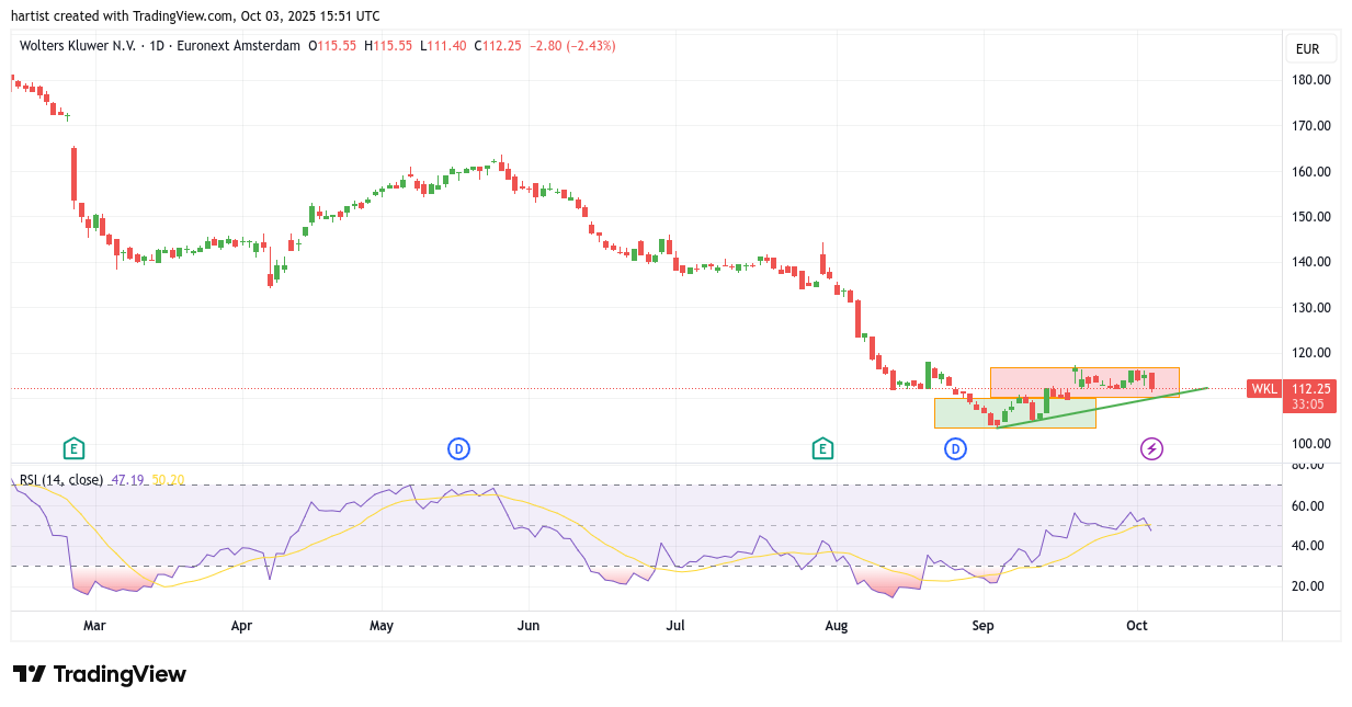 Ik blijf — misschien onterecht — positief en zie de koers doorstijgen naar de rode horizontale weerstandlijn.