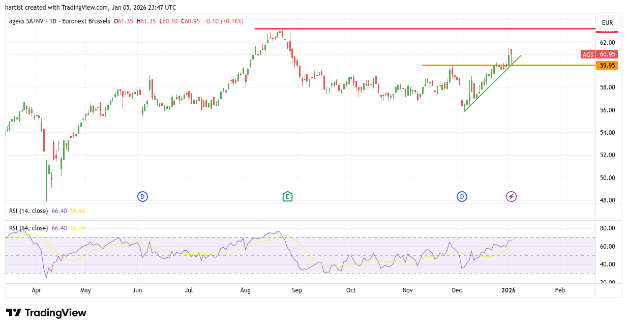We gaan bij Ageas eens kijken of het hogerop wil, de rode lijn zou een target kunnen zijn. Ga of blijf long en kijk iedere keer waar uw stop komt.