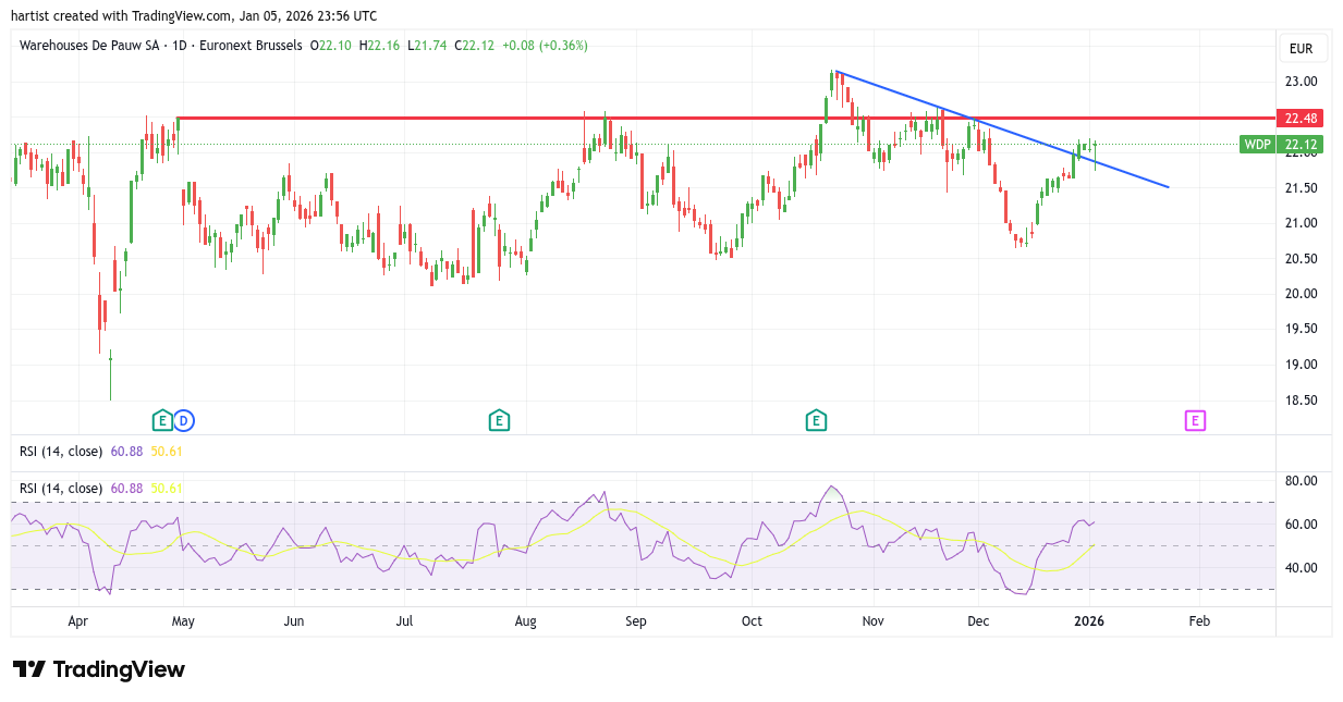 Boven de rode weerstandlijn zit er iets meer rek in de koers, maar nog steeds te weinig voor een trade. Een uitname van de top van oktober vorig jaar zou mooi zijn.