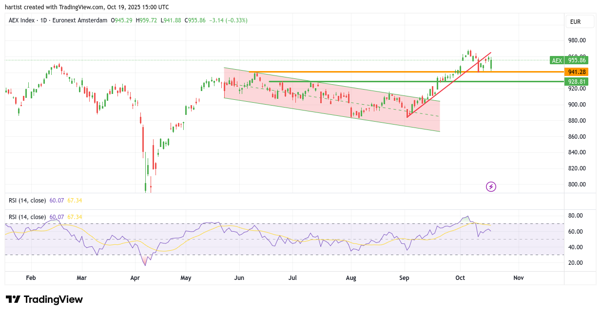 Met deze koers zou ik de AEX op een Houden zetten. Daarbij houd ik in het achterhoofd dat de koers door de rode stijgende trendlijn is gevallen.