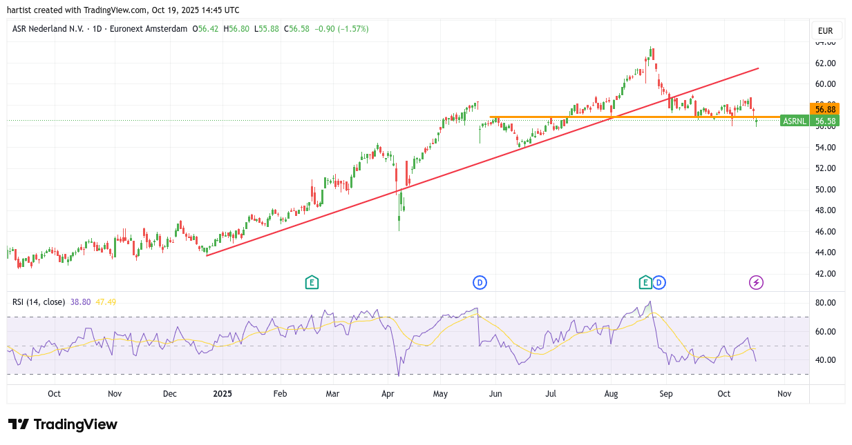 Het is even extra opletten bij ASR. De financial begon met door de rode stijgende trendlijn te vallen. Daarna ging het redelijk naar beneden om de laatste anderhalve maand zijwaarts te gaan. Ik heb een tweede lijn getekend en dat is de oranje horizontale steunlijn. En waarom zeg ik nu dat we extra op moeten gaan letten? Als u long zit dan moet u de ogen niet sluiten voor de slotkoers van afgelopen vrijdag. Die lag namelijk onder die oranje lijn. Het zou niets kunnen zijn, maar wees op u qui vive!