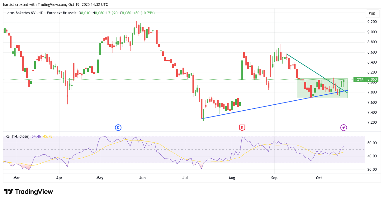 Als eerste zal ik de blauwe trendlijn bespreken. U ziet dat kopers op steeds een hoger niveau Lotus Bakeries willen kopen. Verder heb ik de groene dalende trendlijn getekend. Als iemand die graag anders getrokken wil zien dan ga ik daar in mee. Hoe we hem ook tekenen, de koers is er opwaarts doorheen gegaan.
