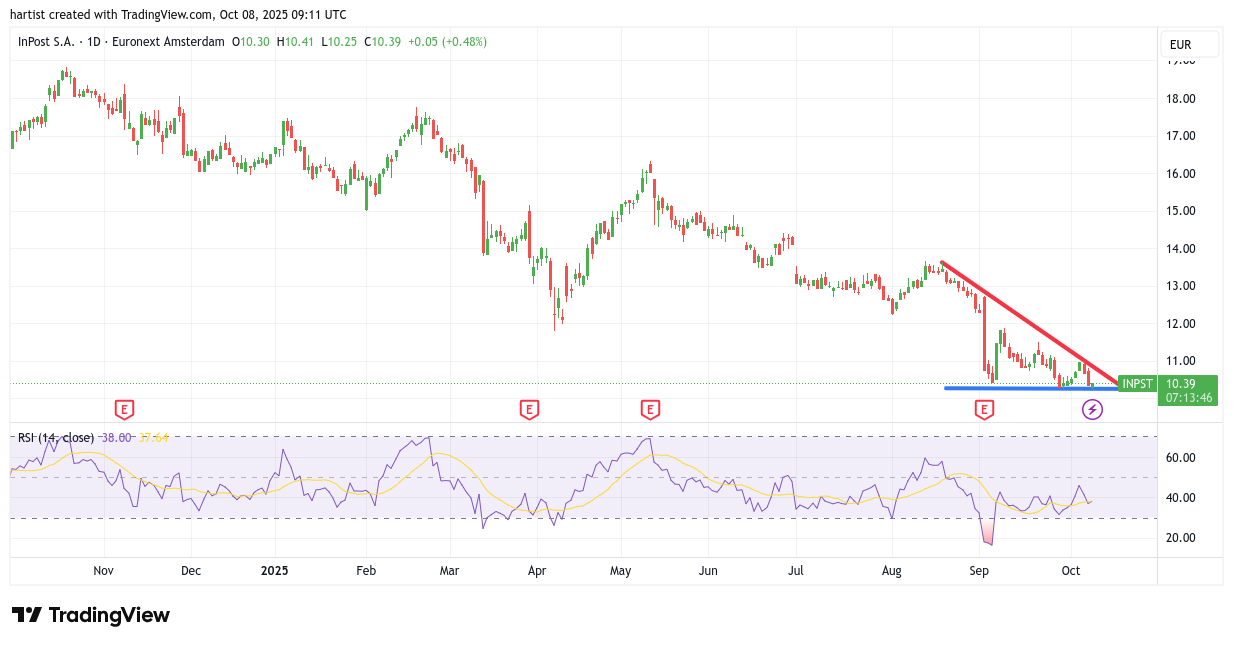 Net als bij Unilever: zit u short in InPost houd dat dan zo. Boven de rode trendlijn wordt het tijd zich achter de oren te krabben.