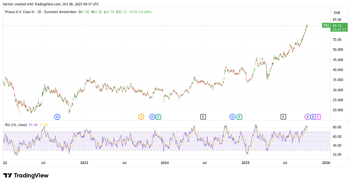 Excuus, ik heb geen rekening gehouden met de overname van Just Eat door Prosus. Zullen we dan maar naar de grafiek van Prosus gaan kijken?