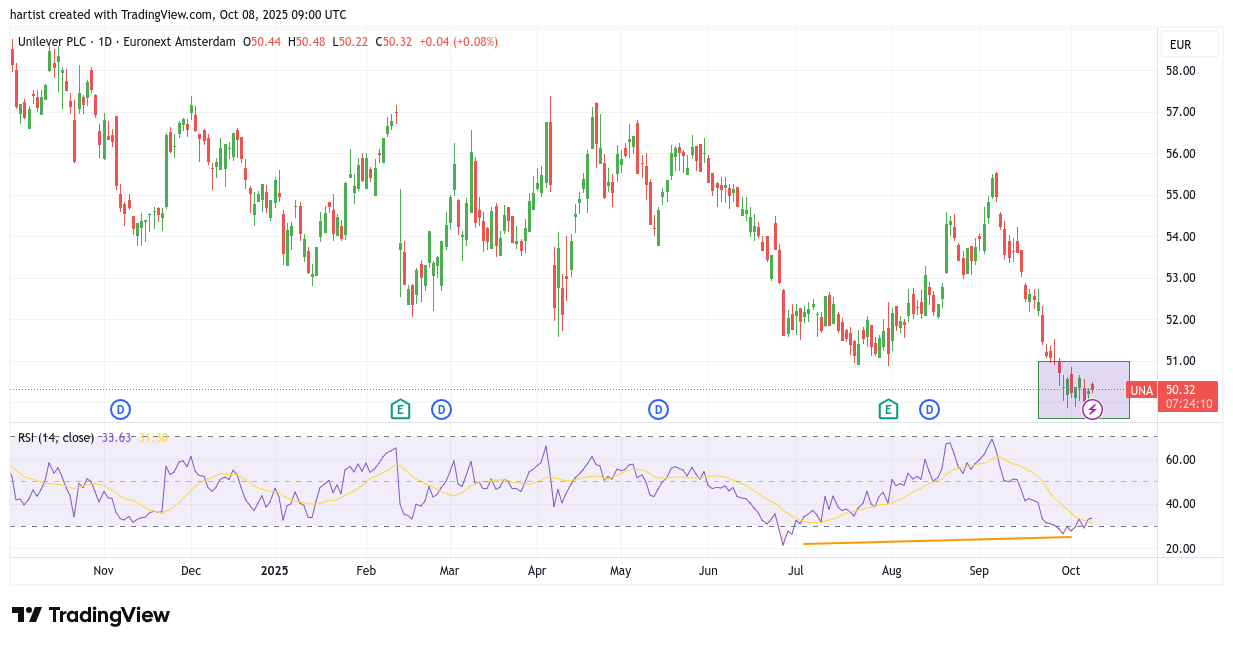 Als de koers vanaf nu een beetje zou willen stijgen, dan zouden we naar een positieve divergentie bij de RSI gaan. Als u short zit: lekker blijven zitten en kijken waar uw stop komt.