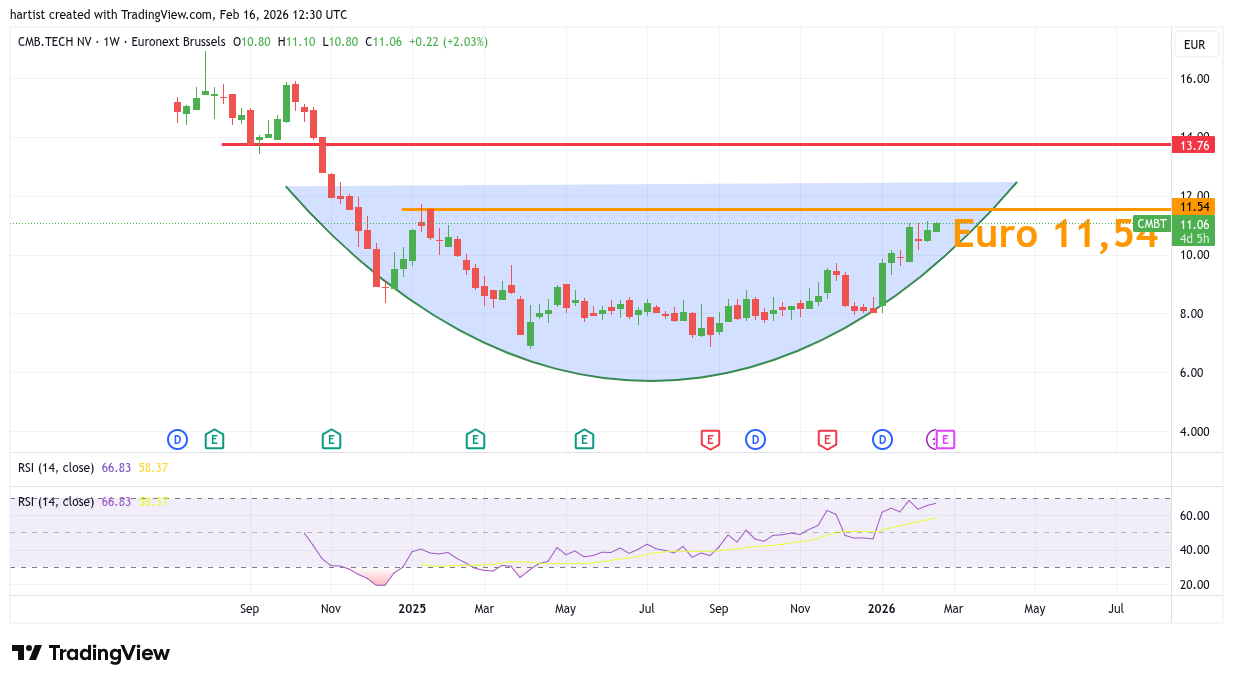 Na de val door de rode steun is CBM verder weggevallen. Er lijkt echter sprake te zijn van een rounding bottom en dat zou kunnen betekenen dat de daling tot een einde is gekomen. Daar zou een bevestiging van komen als de oranje weerstand op euro 11,54 opwaarts zou worden doorbroken. Dat is nu nog niet zover, maar blijf alert. Bij een uitbraak zou u kunnen traden, het zou een rit naar euro 13,76 kunnen opleveren.