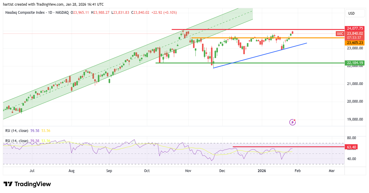 Stapje voor stapje nadert de Nasdaq de rode horizontale weerstandlijn. Die lijn ligt over de top van oktober vorig jaar. Hier ziet u dat de RSI niet enthousiast meedoet, houd dat s.v.p. in het achterhoofd.