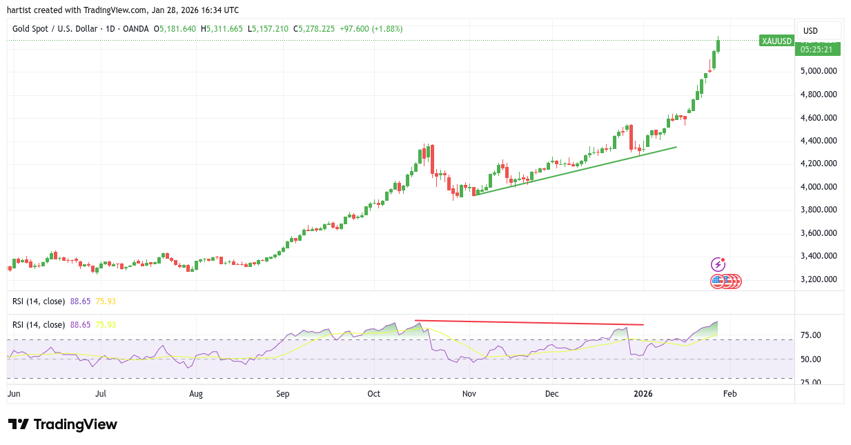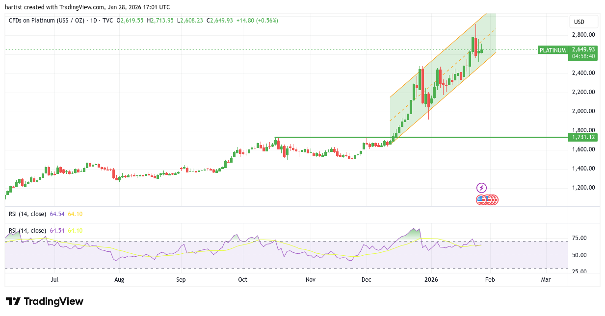 Het lijkt de Goed Nieuws Show wel vandaag, alle grafieken zien er goed uit, alle koersen gaan omhoog. Zij het hier en daar mer een kleine correctie. Platinum vormt er geen uitzondering op. We ziet de rode candle met een correctie, maar de trend is duidelijk opwaarts. Ik kan hier zelfs een stijgend trendkanaal tekenen. Zolang de koers binnen het trendkanaal weet te blijven is het OK. De vraag is of dat gaat lukken, want ook op deze grafiek zet de RSI een duidelijke negatieve divergentie neer. Blijf long, maar check de koers “elke seconde”.