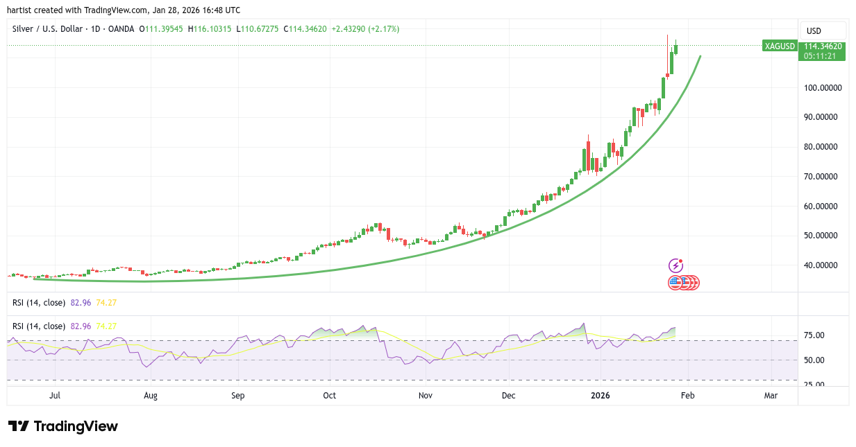 Kan het verder omhoog met het zilver? Jawel, dat kan zomaar. Aan de andere kant, een correctie zou niet meer dan gezond zijn. Ik zou niet long gaan, tenzij met een korte stop. Zit u long? Blijf vooral zitten met een al dan niet strakke trailing stop.
