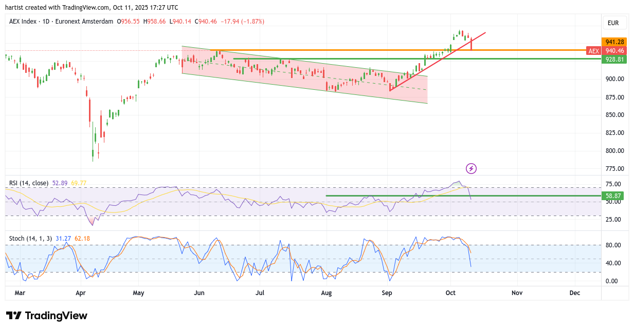 Ik hoop dat als iemand long zat dat men er vroeg of laat uit is gegaan. Ja, er kunnen natuurlijk altijd koopjesjagers in de markt komen, maar ik zou niet raar opkijken als dit de komende beursdagen per saldo nog lager gaat. Ik zou met deze grafiek niet graag long zitten.