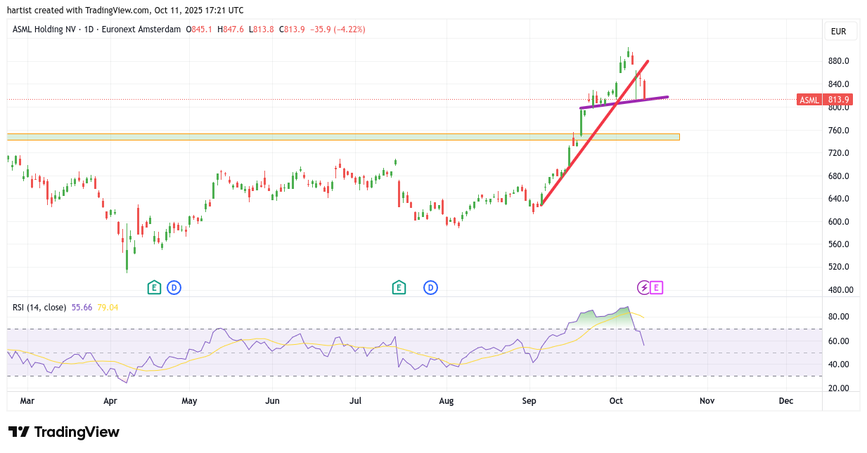 ASML was woensdag al met een gap neer beneden gegaan. Zo vormde zich iets van een eiland, een island reversal. Met die daling ging de koers ook neerwaarts door de rode stijgende trendlijn. Dan tel ik al drie signaaltje van afzwakking. Met een RSI in overbought worden er dat er vier.