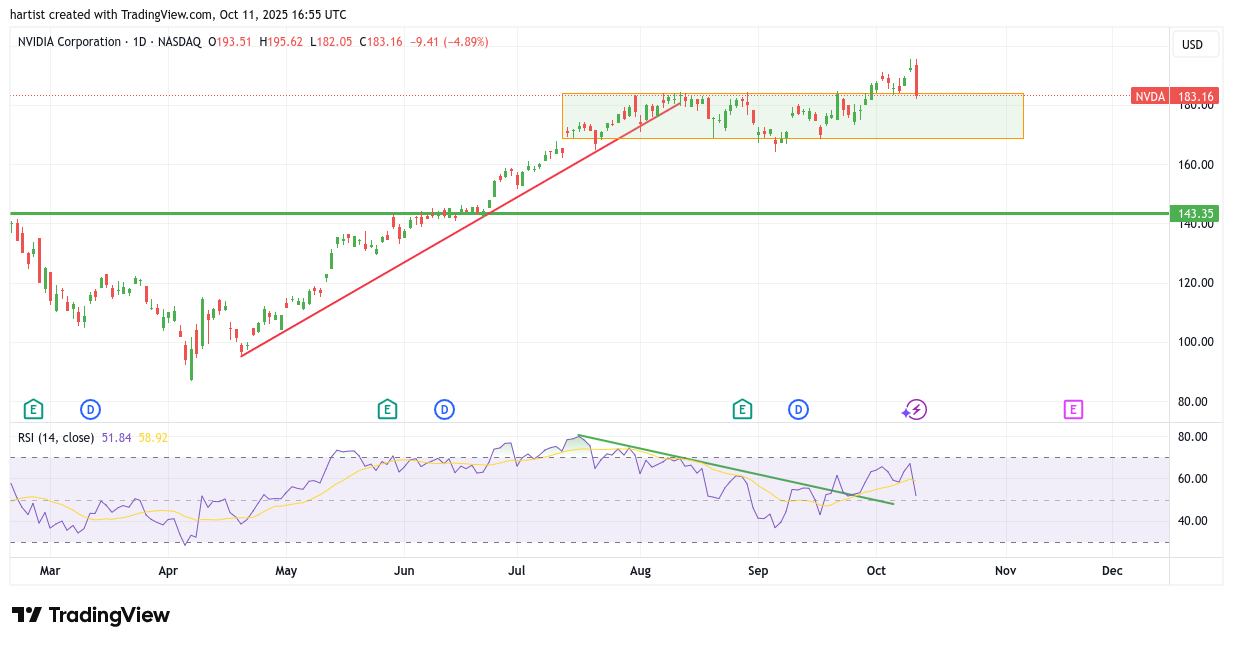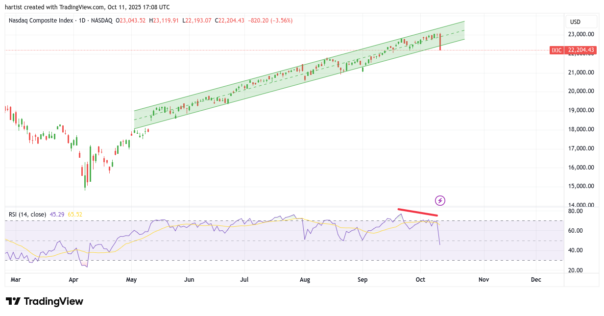 En daaristie dan, de val uit het oh zo mooie stijgende trendkanaal. De enige waarschuwing is een negatieve divergentie bij de RSI. Maar trouwe lezers weten dat we wel vaker een negatieve divergentie zien zonder noemenswaardige gevolgen.