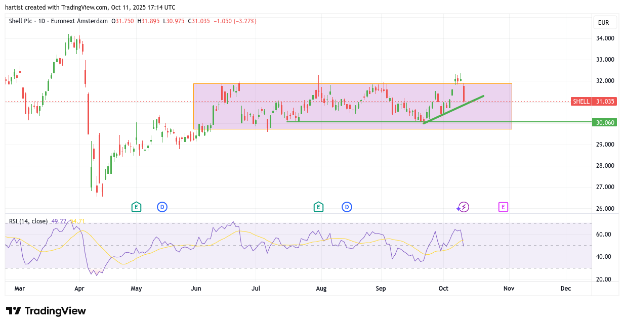 Ging het in Nederland ook omlaag? Zie hier Shell, ja dus. Shell had deze beursweek net de dappere stap genomen opwaarts uit de tradingrange te breken. Maar wie zijn kop boven het maaiveld uitsteekt...