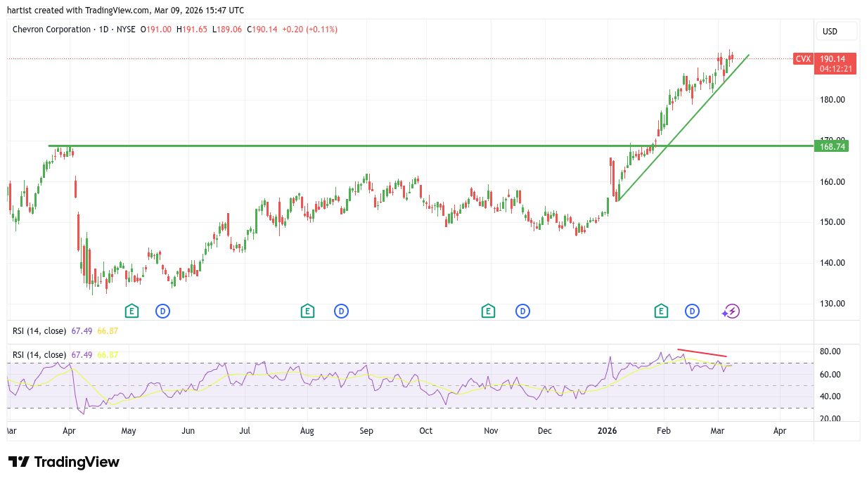 De uitbraak van de groene horizontale weerstand was een belangrijke zet. De koers van Chevron is daarna flink hoger gegaan. Ik heb er een groene stijgende trendlijn onder getekend. De koersgrafiek ligt er goed bij en je zou zeggen dat het boven de groene trendlijn hoger zou moeten gaan. De koersgrafiek is leidend, maar ik ga u toch wijzen op de negatieve divergentie bij de RSI. Niets om in paniek te verkopen als u long zit, maar houd s.v.p. de ontwikkeling in de gaten. Kijk waar uw stop komt.
