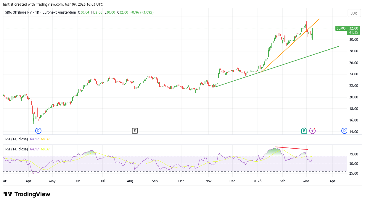 SBM Offshore zit niet bepaald in een dalende trend. Het gaat voortvarend met de koers. Ik heb twee stijgende trendlijnen getekend. De groene was eerst van toepassing en daarna gebeurde alles boven de oranje trendlijn. Ook hier hebben we de negatieve divergentie bij de RSI. Diezelfde RSI was in eerste instantie even in overbought gebied.