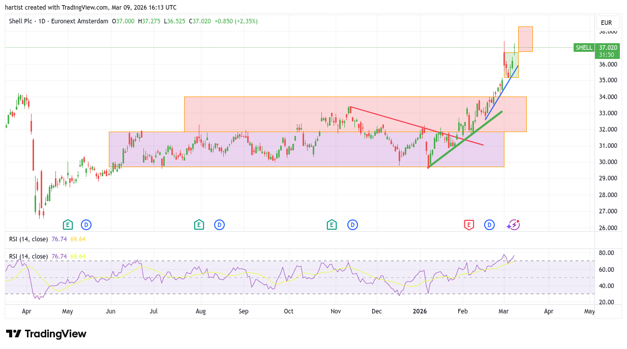 Als Shell op deze koers mag sluiten dan sluit de koers boven het kleine groen/blauwe blokje. De bovenkant van het rode blokje wordt dan de target. Denk aan euro 38,20.