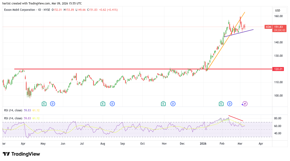 Gelijk aan Chevron, maar dan anders, ging Exxon Mobil door een belangrijke weerstand. Zie hoe de koers om en nabij de jaarwisseling door de rode weerstand ging. Daarna ging de koers steil omhoog boven de oranje trendlijn. Echter, die hellingshoek hield de koers niet vol en nu vindt de stijging plaats boven de paarse minder steile trendlijn. Overigens, zie ook hier de negatieve divergentie.