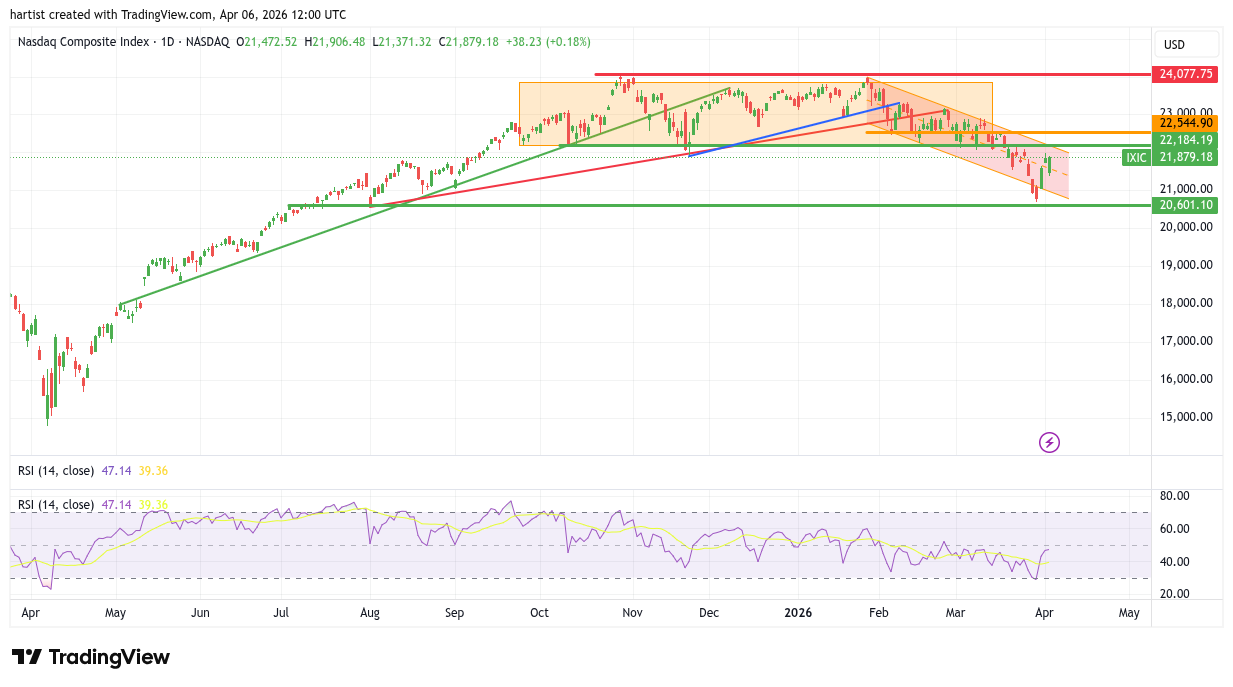 Wat is er recent gebeurd? Wel, de Nasdaq viel uit het dalende trendkanaal maar toen was daar de groene horizontale steun om de zaak op te vangen. Kopers kwamen in de markt en al vrij snel keerde de koers terug binnen het dalende trendkanaal. Dat is natuurlijk mooi, maar we moeten blijven beseffen dat we in een dalend trendkanaal zitten. In ieder geval voor dit moment. Blijf dus zeer voorzichtig.