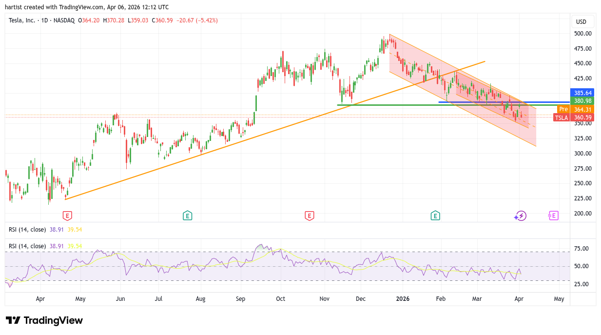 Ik las net een artikel dat ging over o.a. de concurrentie tussen de elektrische auto's tussen Tesla en Chinese alternatieven. Als we naar de grafiek van Tesla kijken dan lijkt Tesla de strijd (in dit stadium) te verliezen. Tesla gaat naar beneden binnen niet een maar twee dalende trendkanalen. Toegegeven, het kleine dalende trendkanaal is mooier dan het grotere.