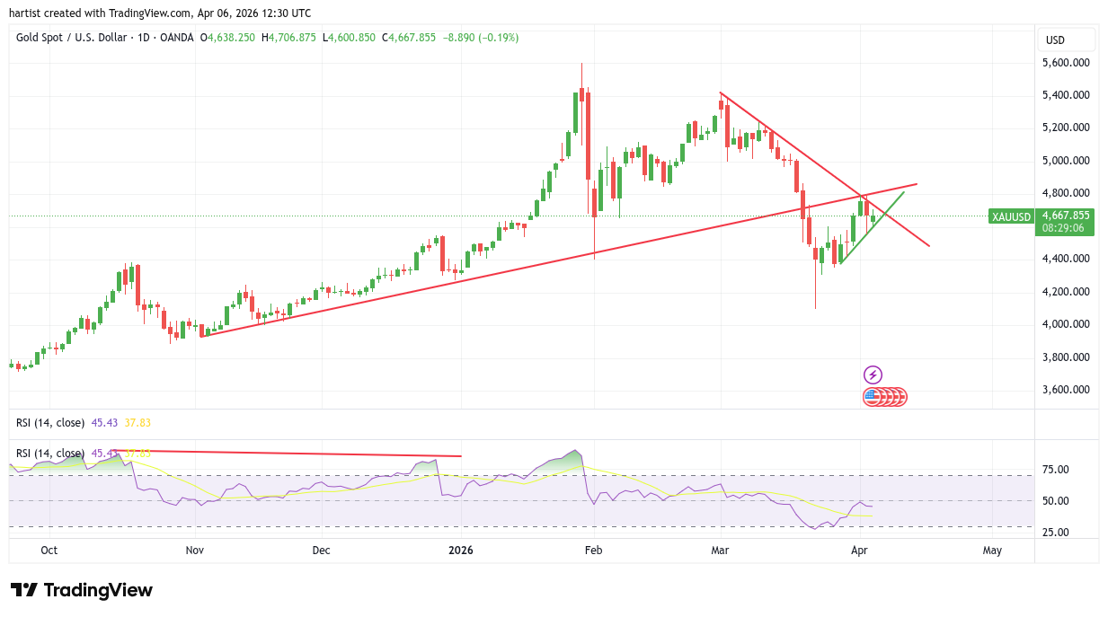 De rode stijgende trendlijn is neerwaarts doorbroken en inmiddels als (nieuwe) weerstand getest. De rode dalende trendlijn heb ik vers getekend en die ligt over drie toppen. Het groene stijgende trendlijntje stelt nog niet veel voor, maar is natuurlijk wel hoopgevend voor diegene die gaat voor een hogere goudkoers. Vandaag werd het lijntje nog even intraday getest, een geslaagde test tot nu toe.
