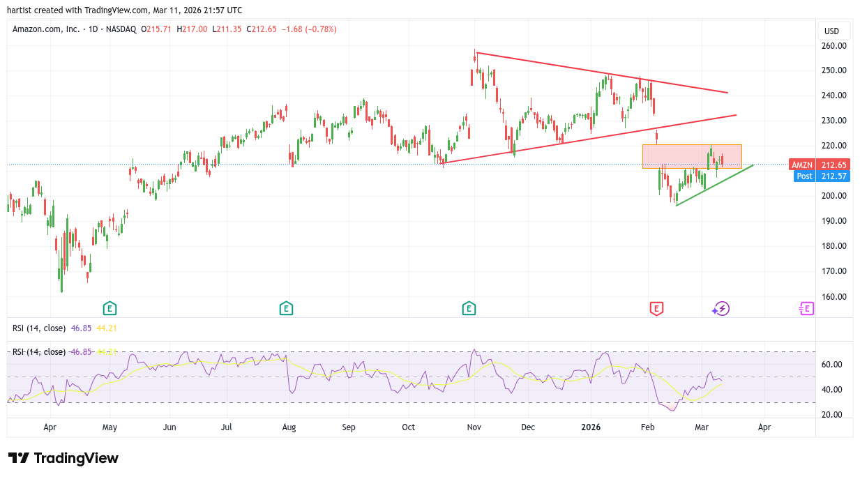 Ik heb met de twee rode lijnen een driehoek kunnen tekenen en iedereen kan zien dan Amazon daar aan de onderzijde uit is gegaan. Dat ging gepaard met een gap en de dag daarop zakte de koers verder, wederom met een gap. De koers stabiliseerde daarna en inmiddels heb ik voorzichtig een groen stijgend trendlijntje kunnen tekenen. Ook is de window gesloten, de koers heeft de bovenzijde van de gap bereikt.