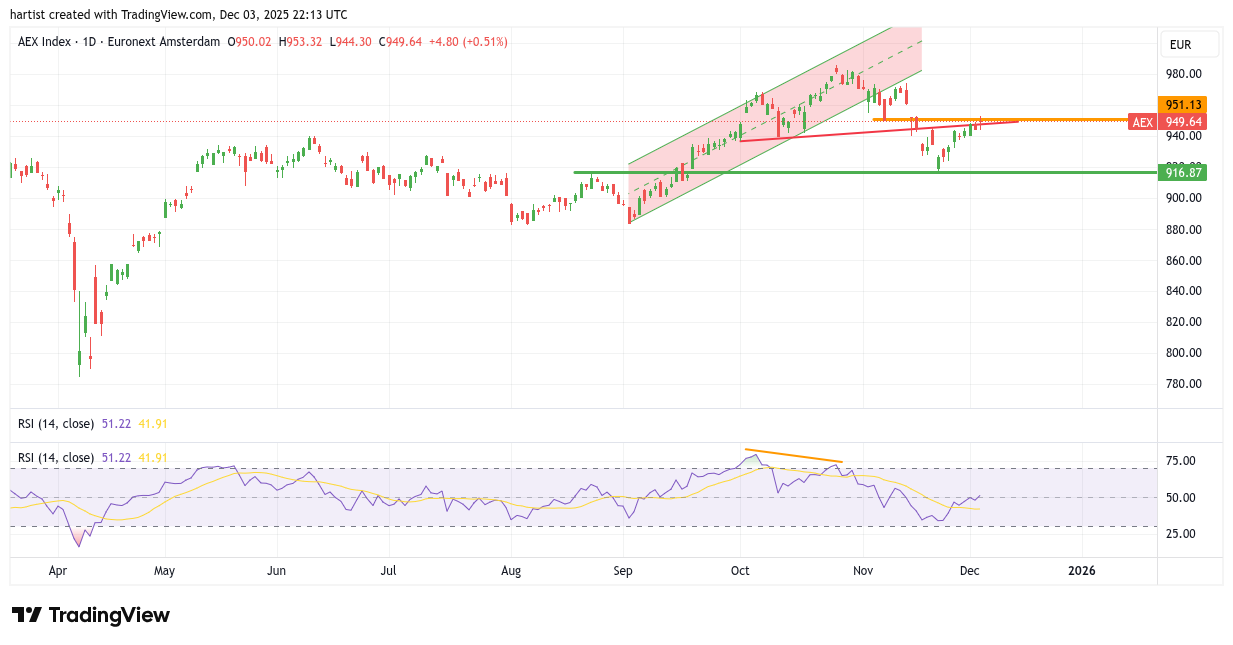 Zit u neutraal blijf dan zo. Ik zou de AEX op de watchlist zetten en instappen bij een onverwachte opwaartse uitbraak van die dubbele weerstand.