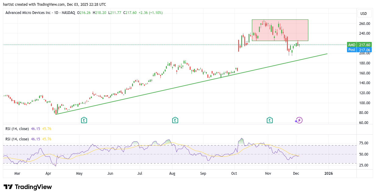 Waar we nu bij Advanced Micro Devices rekening moeten houden is toch weer een daling. De target ligt ongeveer op de groene stijgende trendlijn…