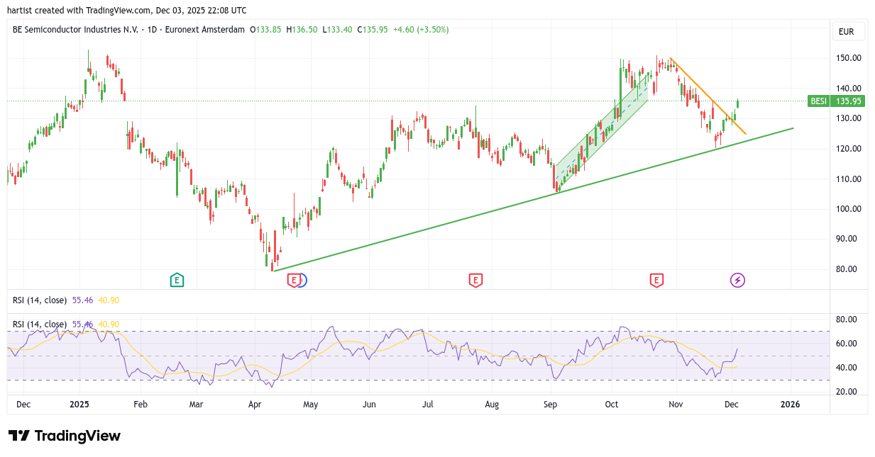 Her vergaat BESI technisch duidelijk beter dan Oracle. Een basis is de groene stijgende trendlijn. Daarboven heeft de koers de oranje dalende trendlijn kort na een test van die groene lijn opwaarts doorbroken. De afgelopen negen beursdagen hebben we een mooie stijging gezien. De kans is reëel aanwezig dat de koers door kan stijgen.