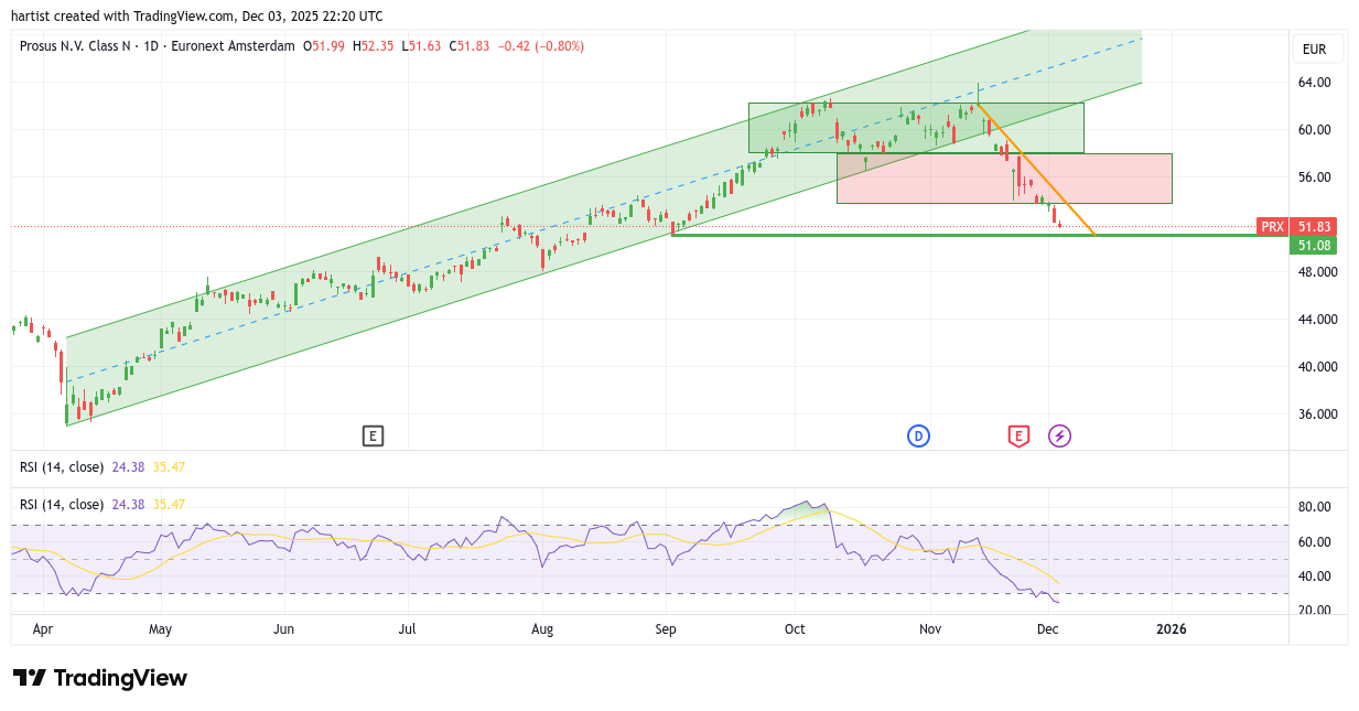 Ik vind dit een mooie grafiek. Dat is niet omdat Prosus er technisch goed bijligt, maar omdat er veel in de grafiek zit.