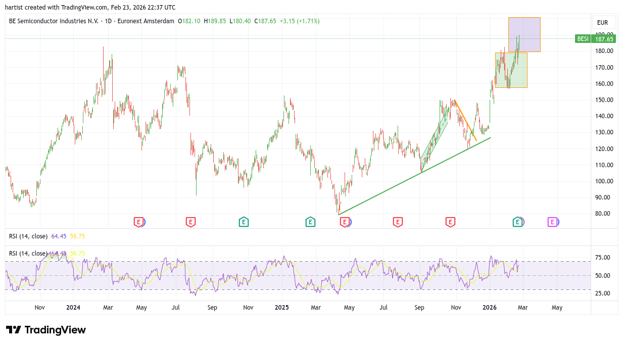 Ook BESI heb ik met veel koershistorie geplot, zodat het verleden goed zichtbaar is. Zo zien we dat de bodem in april 2025 een niveau is dat we sindsdien niet meer hebben terug gezien. Met pieken en dalen zit de schwung er goed in bij BESI.