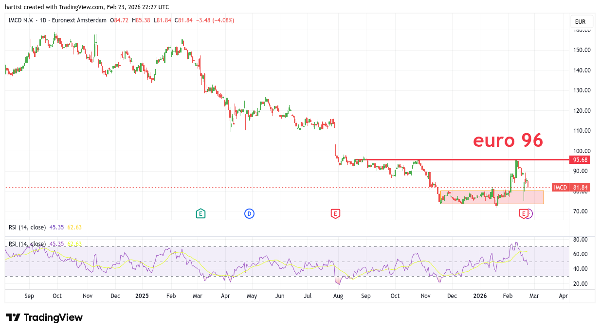 De rode balk lijkt een reële steunzone, de koers is er nog niet onder geweest behalve eventjes in januari. Dat werd gevolgd door een opwaartse uitbraak en het koersdoel, de hoogte van de bandbreedte bovenop de tradingrange, werd met gemak gehaald en zelfs ruim overtroffen. De koers reikte tot zo’n 96 euro, het niveau dat u noemt. Daar was de pret echter over, de daling zette in en die reikte zelfs tot diep in die steunzone.