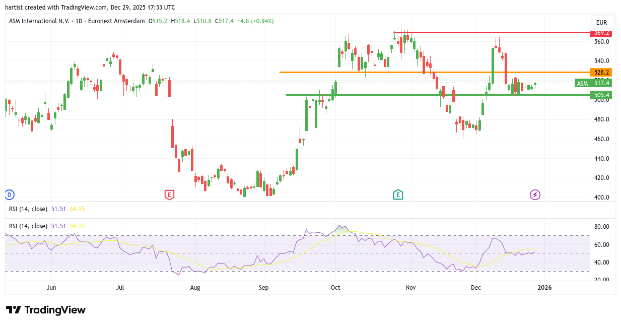 Na een forse beweging opwaarts volgde enkele dagen later een forse aderlating. In beide gevallen speelde de oranje horizontale lijn geen rol van betekenis. De groene horizontale steun werd met succes getest en sindsdien komt ook ASM International niet echt van zijn plaats. Bij dit aandeel en bij Microsoft lijkt het erop dat de actieve partijen, die voor beweging op de beurs zorgen, op vakantie zijn.