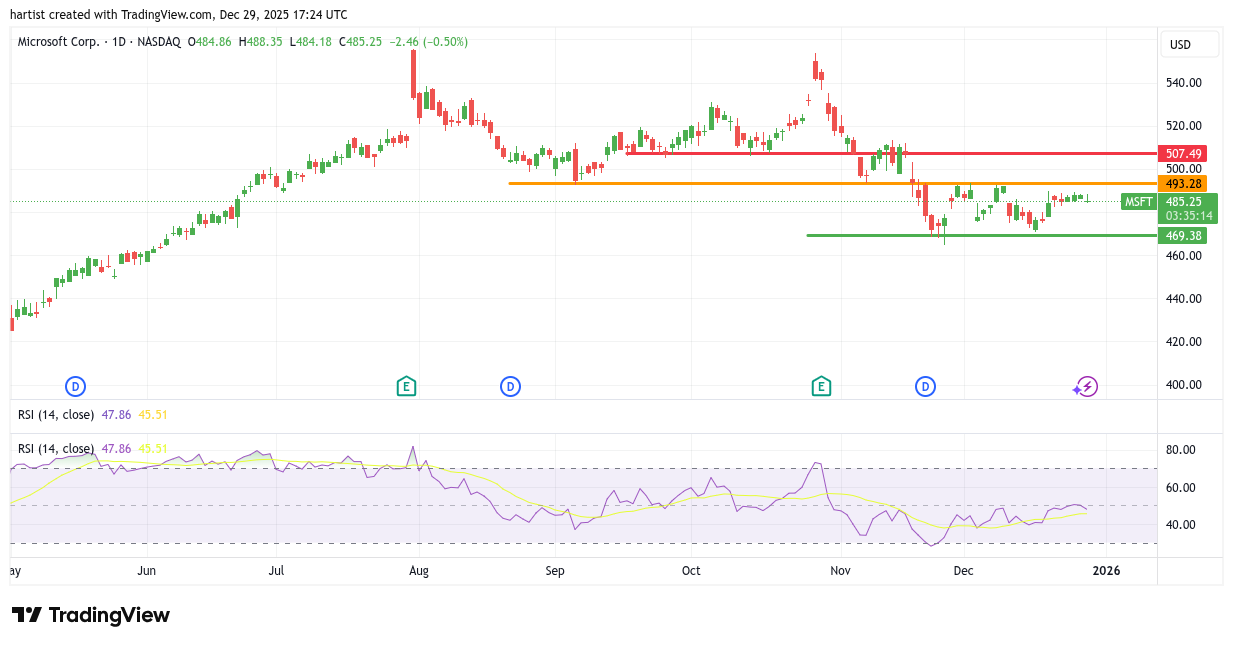 Net als de Nasdaq (zie de column van vanmorgen vroeg) is Microsoft aan een zijwaartse beweging bezig. Aan de onderzijde ligt de groene lijn op ongeveer Usd 469. Aan de bovenzijde ziet u de oranje lijn op een niveau van 493. Dan hebben we het over een bandbreedte van 24 dollar. Zouden we vervolgens inzoomen op de laatste zes beursdagen dan lijkt de koers niet veel van zijn plaats te komen.