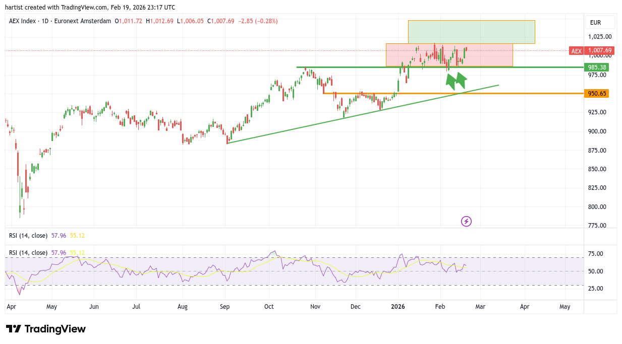 Hoe staat het met de AEX? Wel, de Nederlandse index is per saldo zijwaarts aan het bewegen. Zie de beweging van pakweg de laatste twee maanden binnen het rode blok, de tradingrange. Nu weten we een ding, vroeg of laat zal de koers uit de range gaan. Ik heb hier voorgesorteerd op een uitbraak aan de bovenzijde, maar een uitbraak aan de onderzijde kan natuurlijk ook. Ik acht de kans op een opwaartse uitbraak echter iets hoger, vandaar.