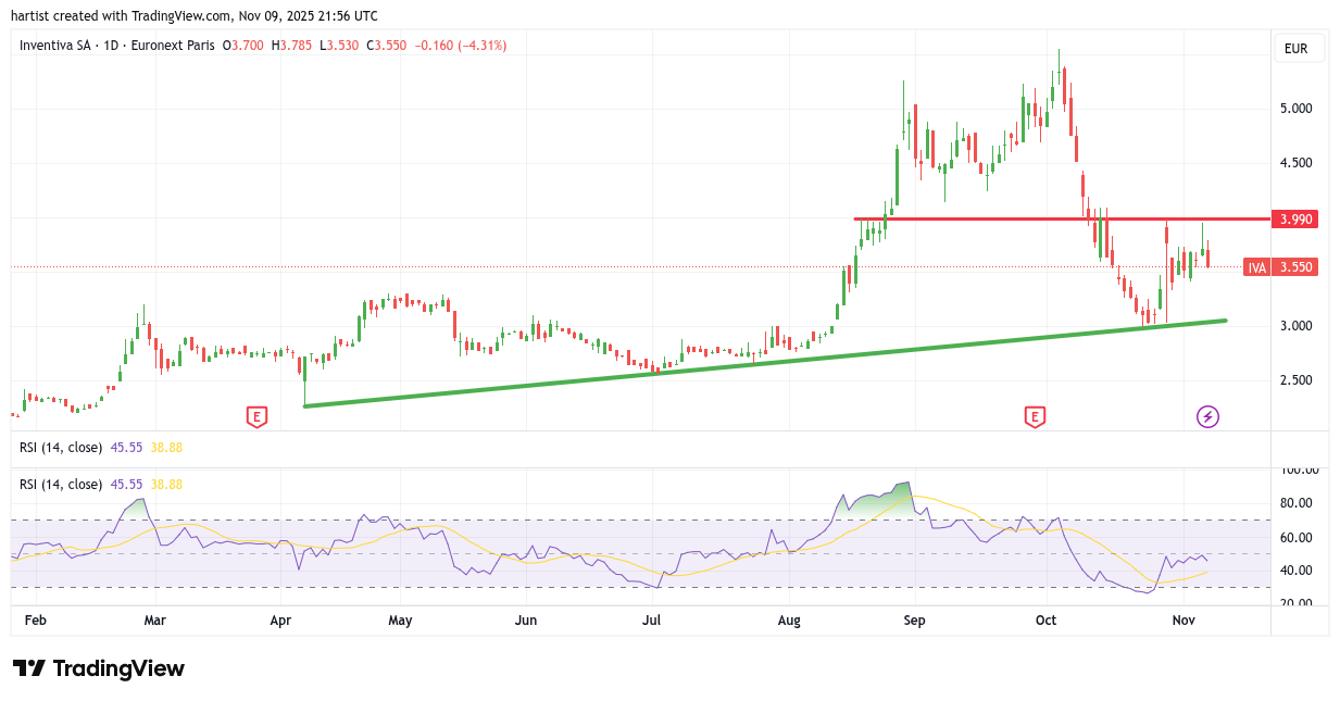 The trend is your friend, ik zou dus long blijven zitten. Een eerste signaal van (lichte) afzwakking zou een koers onder de stippellijn zijn.