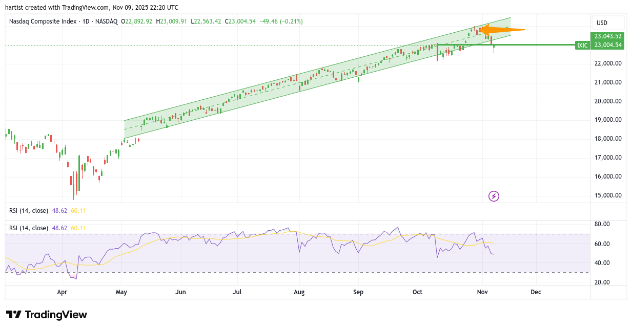 Ik moet bekennen dat ik deze index uit het oog ben verloren, dus leuk dat u hem aanvraagt. Ik heb een stijgend trendkanaal getekend. Het is geen heel mooi stijgend trendkanaal, maar het geeft zeker de mooie stijgende trend aan. De bovenkant is recent getest en nu probeert de koers steun te zoeken op het midden van het trendkanaal. Als u goed kijkt dan ziet u daar een stippellijn lopen.
