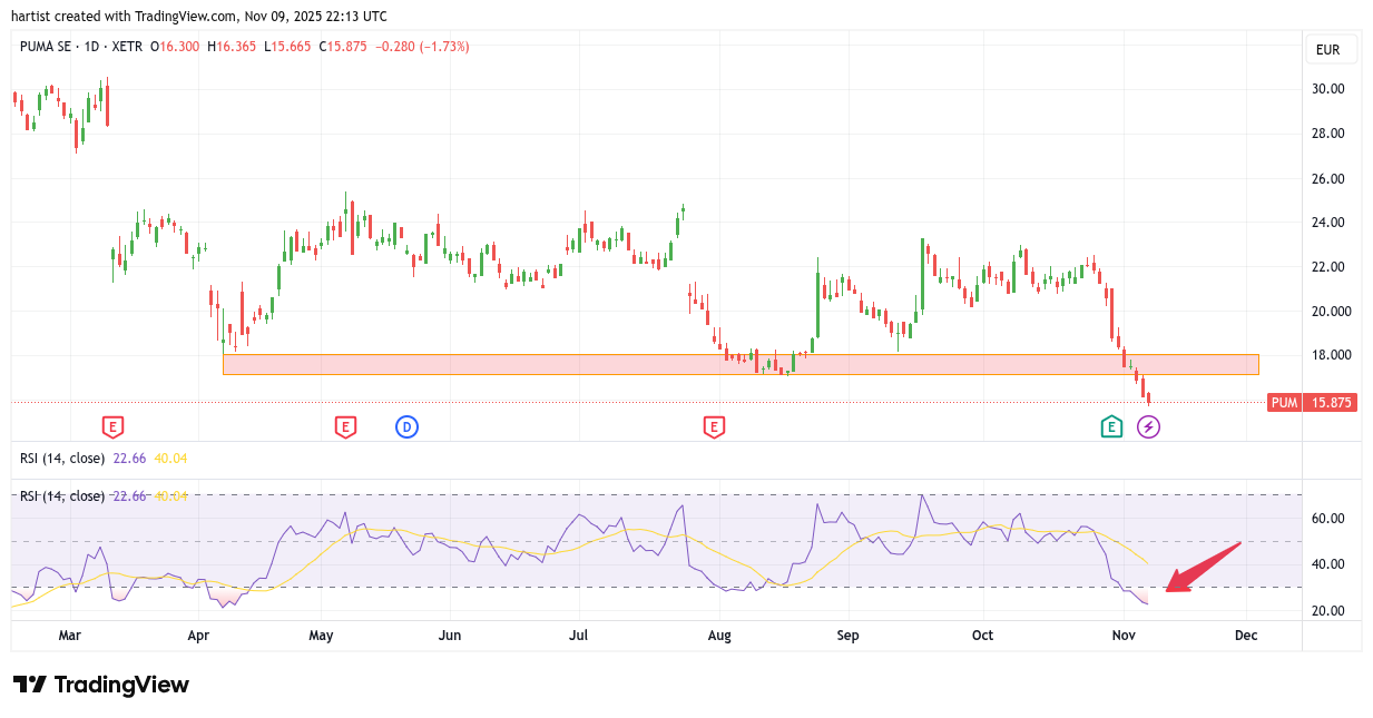 Puma is een totaal andere grafiek dan die van de Nikkei, deze ziet er niet best uit. Tenzij u short zit. De afgelopen beursweek is de koers door de rode steunbalk gegaan en die balk doet nu dus dienst als weerstand.