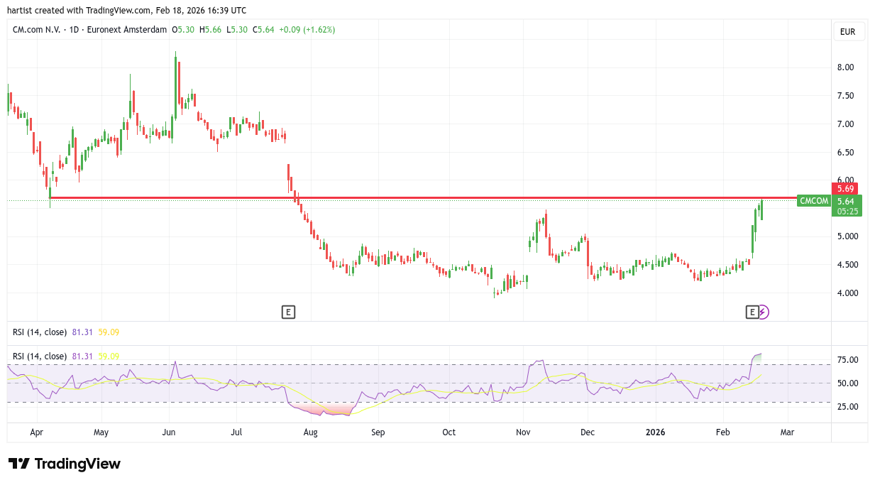 Op basis van de cijfers die op 13 februari bekend werden gemaakt sprong CM.com aardig omhoog. De cijfers vielen in de smaak. In de grafiek zag ik dat niet aankomen, maar de alerte trader had gedurende de sessie 13 februari kunnen instappen voor een rit naar de rode weerstandlijn. En dat is het niveau waar het aandeel zich nu bevindt.