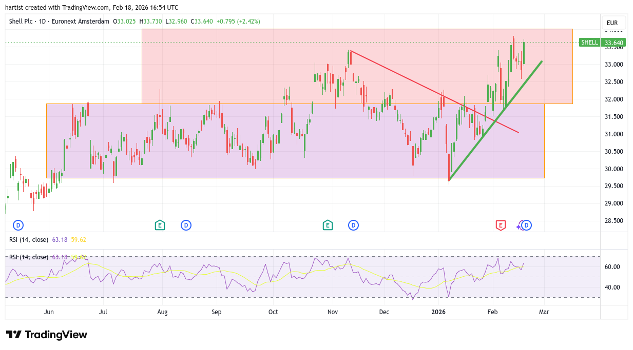 Gaan we het nu toch nog meemaken bij Shell? Gaat het aandeel toch nog naar het oorspronkelijke koersdoel, de bovenzijde van het rode blok? Ongeveer een week geleden opende de koers er al zeer dichtbij. Het bereiken van het koersdoel zou dan met zo’n 4 maanden zijn uitgesteld. De eerlijkheid gebiedt te zeggen dat het koersdoel al in november van tafel kon. Dit zou nu als een soort bonus beschouwd moeten worden. Boven de groene trendlijn lijkt het dan toch te gaan gebeuren.