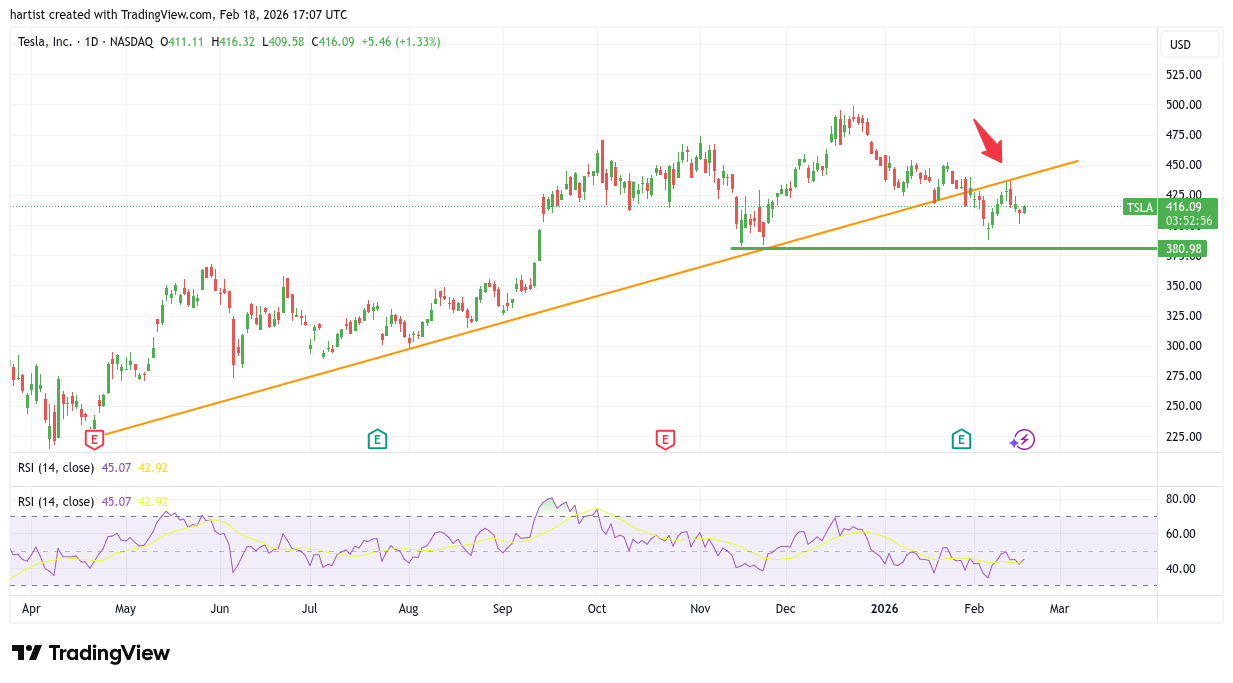 Bij Tesla is het even goed opletten als u (nog) long zit. Er zijn al een aantal lagere toppen en lagere bodems. Daarnaast is de oranje stijgende trendlijn neerwaarts doorbroken. En als meest recente wapenfeit zien we dat de laatste top de neus stootte tegen, jawel, de oranje stijgende trendlijn. Deze lijn doet nu dienst als steun.