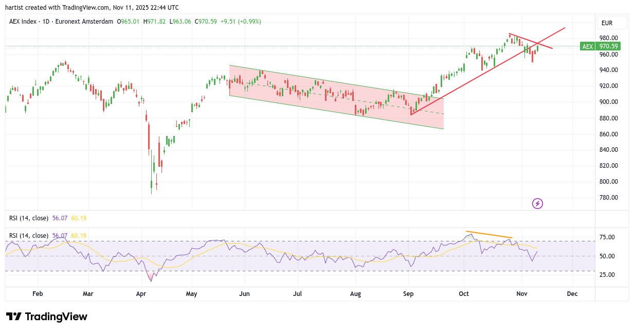 Hum, rode lijnen bij de AEX. Ik wil me bijna verontschuldigen. Maar op dit moment is het toch echt zo. De rode stijgende trendlijn is neerwaarts doorbroken en de opleving van vandaag moet tot nu toe worden gezien als een pull back. Die stijgende trendlijn is nu weerstand.