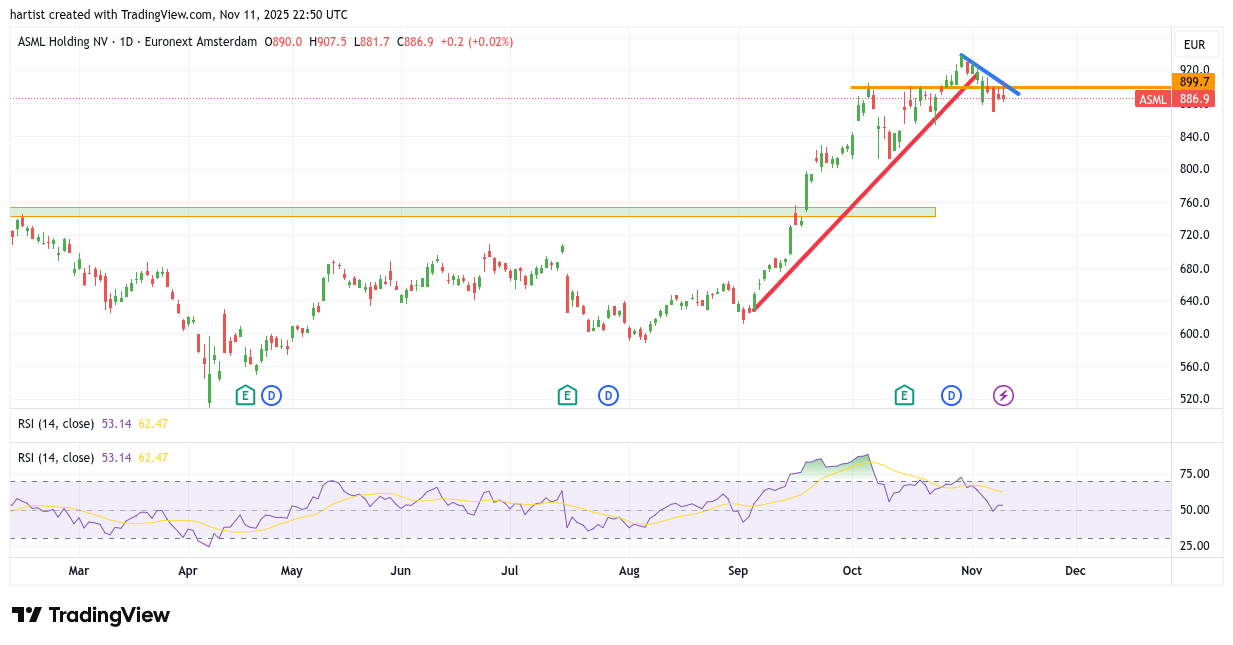 Mocht u long zitten in ASML dan is het wel zaak goed op te letten. De koers staat namelijk onder drie lijnen: